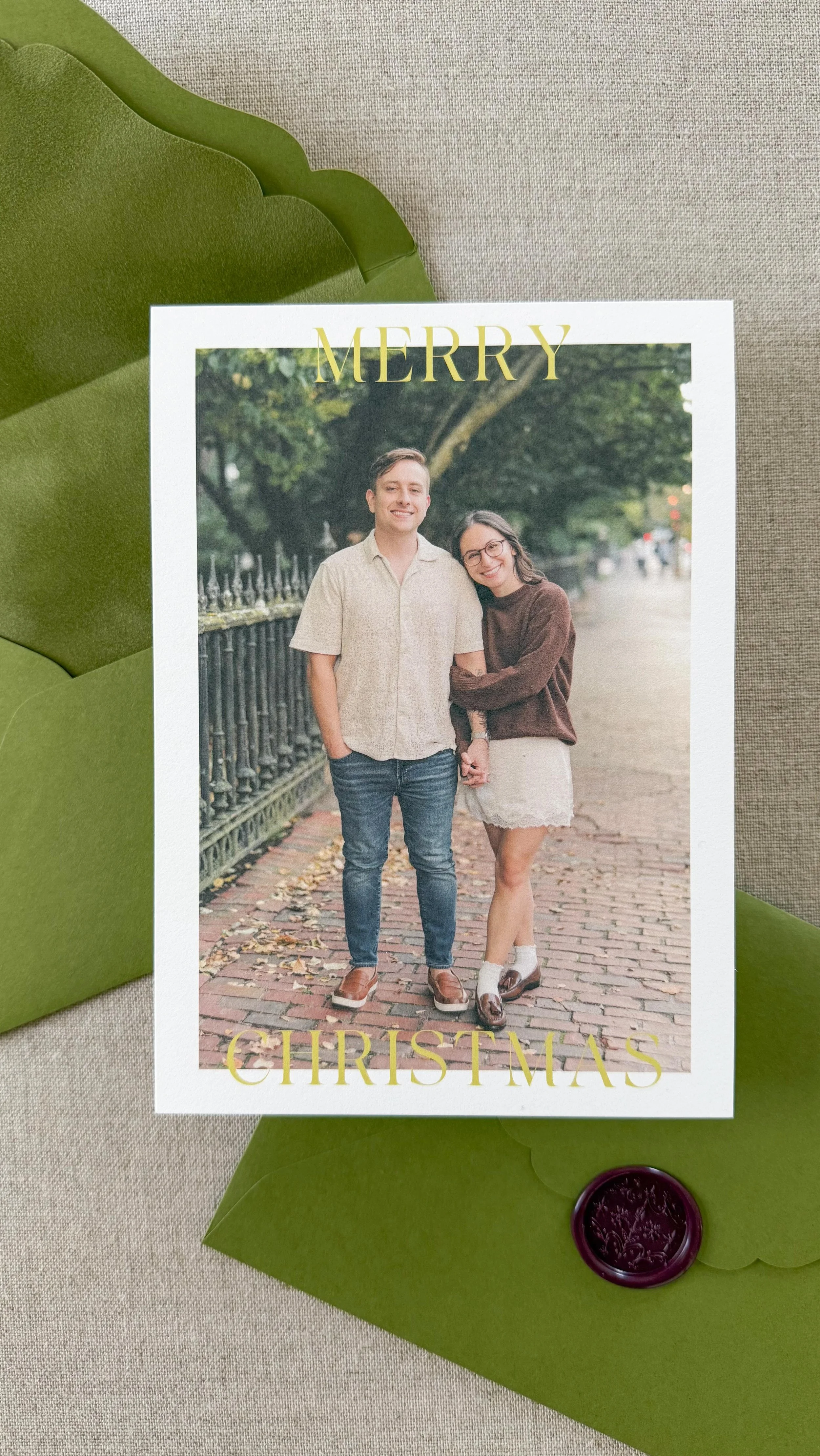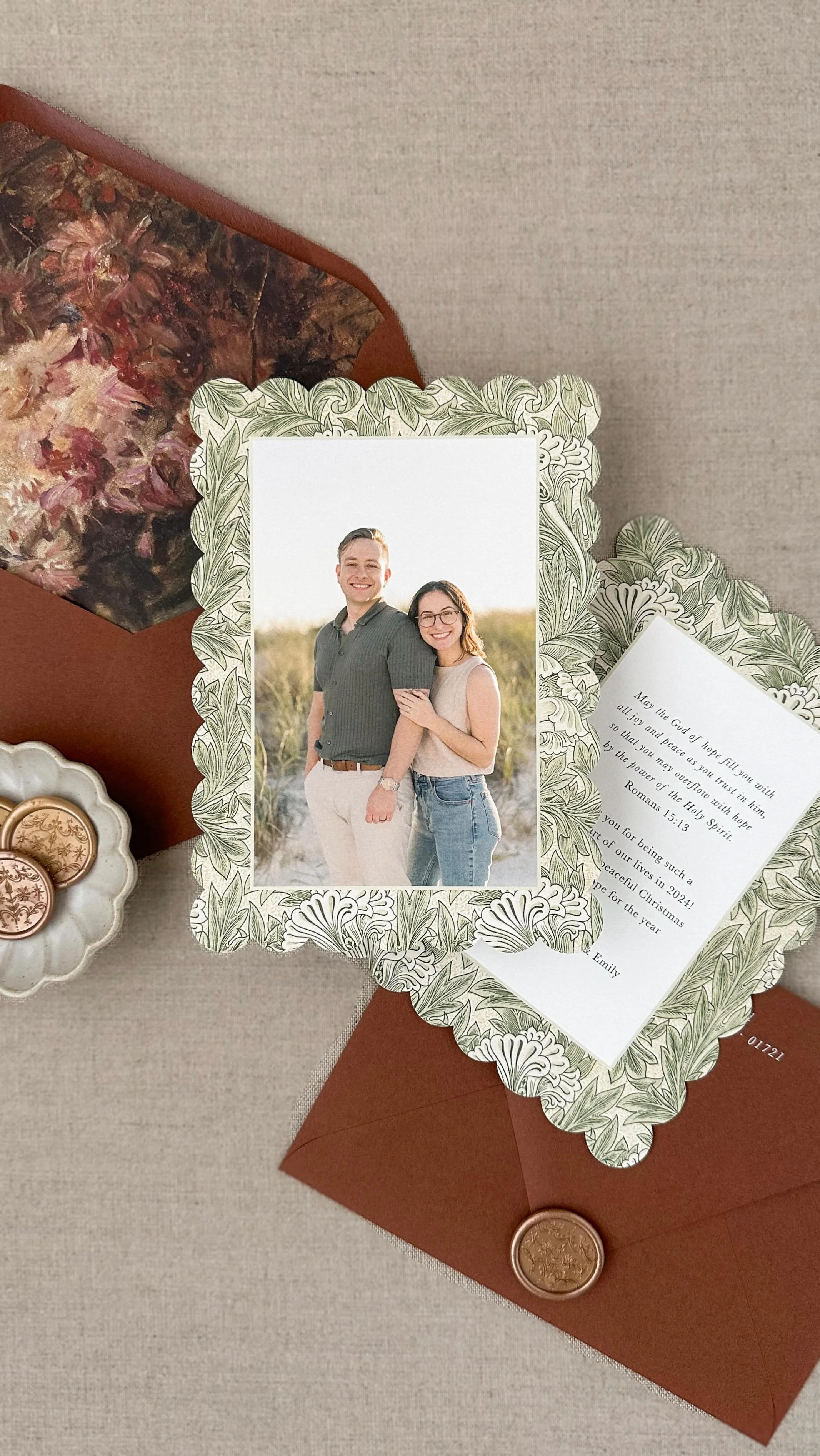 We used one of Ruthie’s own photos for the envelope liner - highlighting the early morning light on Siesta Key Beach. For the outside of the envelope, I mixed a custom color ink for calligraphy and curated a postage set that blended current and vintage postage. Sailboats, seashells, and flowers pulled the theme together.