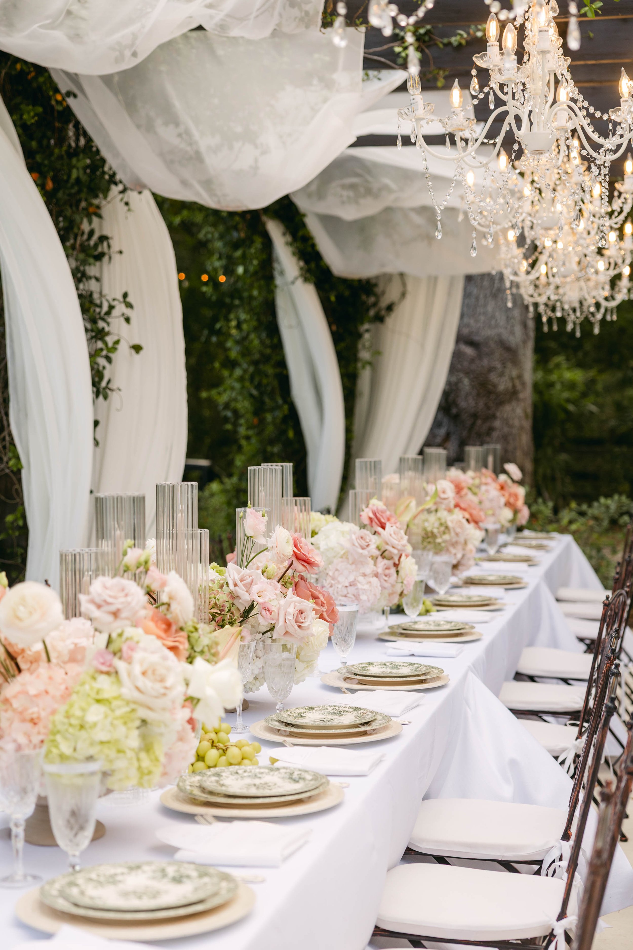 Transitioning into the day-of details, we continued the natural textures and Italian feel into their stationery. Guests were first greeted by an eight foot linen welcome sign, bringing an element of fluidity and natural texture to the design. Woven baskets of parasols surrounded the sign for an Italian touch, while also practically shielding guests from the sun. The ceremony was held under the iconic gazebo, where Nandi brought out the show-stopping florals in shades of pink and green. During cocktail hour, guests sipped on drinks from Lilyβs Bar, one of many nods to their sweet goldendoodle back home. I drew a line illustration of Lily on the cocktail napkins as well, which were scattered through their charcuterie grazing table. Another large-scale linen sign was used as a seating chart to guide guests to their seats. Each table was set with gorgeous green floral dinnerware, topped with oval menus and matching green silk ribbon. Guestβs names were hand-written in calligraphy along the perimeter of the oval shapes. After dinner, they danced the night away and Jessica changed into not two, but three stunning dresses. Together, she and Brett assembled their millefolgie wedding cake and spent the next day by the pool with all their favorite people. It was truly a weekend to remember!